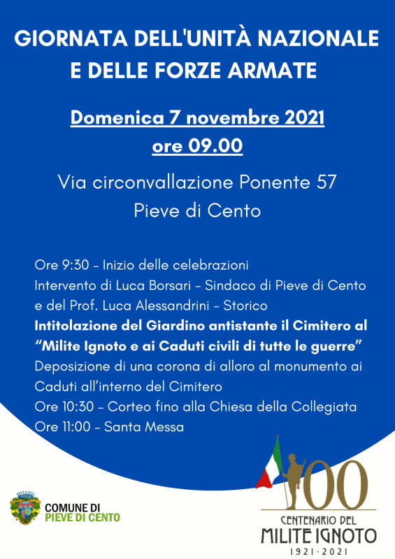 7 novembre 2021, alle 9.30, sarà intitolato il giardino del cimitero al "Milite Ignoto e ai Caduti civili di tutte le guerre” e sarà deposta una corono d'alloro al monumento ai Caduti posto all'interno del cimitero. Seguirà la Santa Messa presso la Chiesa della Collegiata.