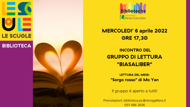 Discuteremo insieme del libro che abbiamo scelto il mese scorso, Sorgo rosso di Mo Yan, e sceglieremo quello da leggere per il prossimo incontro.
