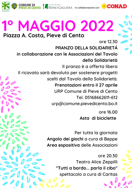 In occasione del 1° Maggio, Festa nazionale dei Lavoratori, le Associazioni del Tavolo della Solidarietà in collaborazione con il Comune di Pieve di Cento e l'Unione Reno Galliera organizzano, in Piazza A. Costa il