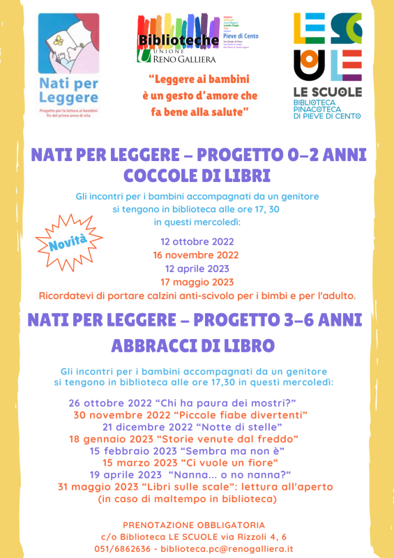 E' richiesta la prenotazione: Biblioteca LE SCUOLE via Rizzoli 4, 6 - tel. 051/6862636 - biblioteca.pc@renogalliera.it