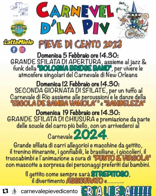 Grande Sfilata di carri allegorici e macchine da gettito, il trenino itinerante, i gonfiabili, le brasiliane, i giocolieri, il trucca bimbi e l'animazione a cura di “Punto e Virgola” con mascotte a sorpresa dei personaggi preferiti dai bambini.