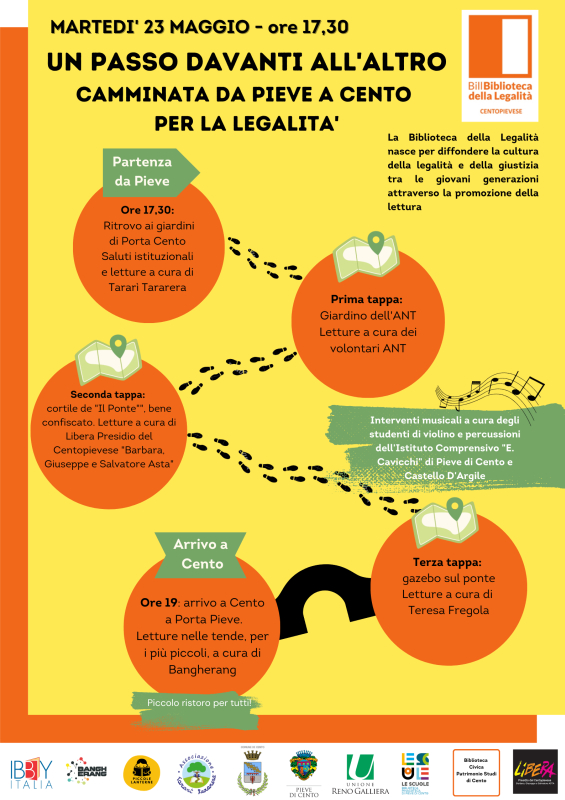 La camminata della Legalità è organizzata dal Patto per la Legalità - BILL (Biblioteca della Legalità) del Centopievese e coinvolge: Ibby Italia, i Comuni e le Biblioteche di Cento e Pieve di Cento, l'Unione Reno Galliera e le associazioni Libera del Centopievese, Tararì Tararera e Bangherang.