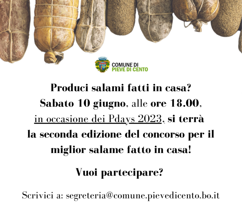 Sabato 10 giugno, alle ore 18.00, in occasione dei Pdays 2023, si terrà la seconda edizione del concorso per il miglior salame fatto in casa!