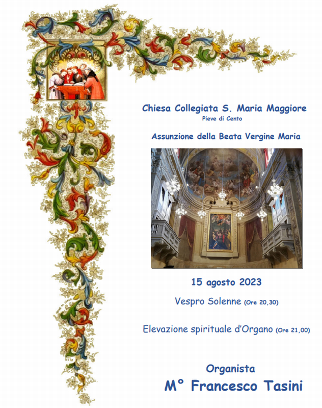 Martedì 15 agosto 2023 alle ore 21.00 l'Organista Maestro Francesco Tasini eseguirà un'Elevazione Spirituale sul Nuovo Organo Zanin ubicato nella Collegiata, recentemente inaugurato il 1° novembre 2021. La suonata sarà anticipata, alle ore 20.30, dalla celebrazione del Vespro Solenne dell'Assunta in canto “comitante organo“.