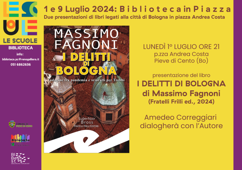 Lunedì 1° luglio alle 21.00 la Biblioteca comunale "Le Scuole" di Pieve di Cento" si sposta in piazza Andrea Costa per la presentazione dell'ultimo giallo di Massimo Fagnoni, "I delitti di Bologna" (Fratelli Frilli, 2024).
