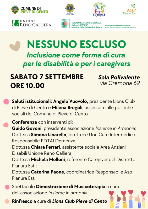Insieme in Armonia, Lions Club di Pieve di Cento, Area Sociale Unione Reno Galliera, Distretto Pianura Est, Asp Pianura Est e Azienda Usl di Bologna.