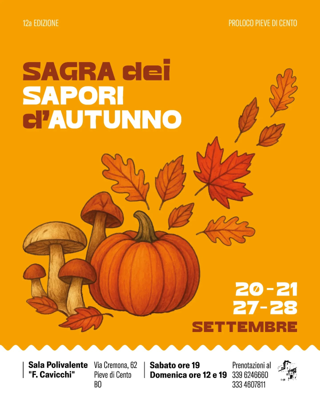 Il 20-21 e 27-28 settembre Pro Loco vi aspetta, Sala polivalente, Via Cremona 62, alla 12esima edizione della Sagra dei Sapori d'Autunno.