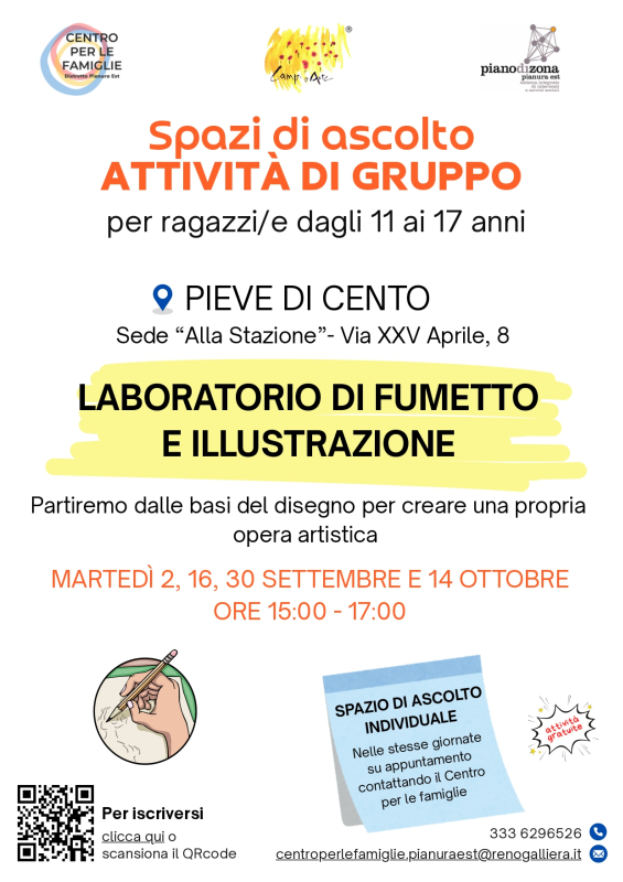 Al via martedì 2 settembre, presso il Centro per le famiglie di Pieve di Cento (“Alla Stazione”- Via XXV Aprile, 8), un nuovo corso per ragazzi dagli 11 ai 17 che tratterà di Fumetto e Illustrazione.