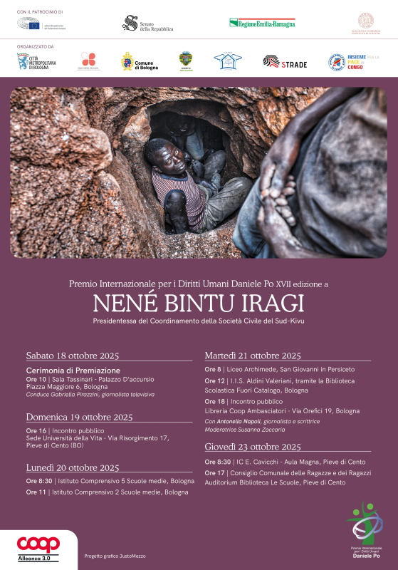 Per l'edizione 2025 del Premio giunta alla 17° edizione il comitato scientifico ha designato come vincitrice Nenè Bintu Iragi, avvocato e presidentessa della Rete delle associazioni per i diritti del Sud Kivu, attiva per la difesa di diritti umani nella Repubblica Democratica del Congo, paese in guerra da 30 anni. Esule in Burundi per minacce di morte, la Premiata porterà a Cento a studenti e privati cittadini la sua testimonianza in favore di diritti di donne e bambini sfruttati ogni giorno dai padroni della guerra e dei diamanti La premiata incarna la forza di chi non tace davanti alle ingiustizie, lottando per la pace e l'uguaglianza di genere nella Repubblica Democratica del Congo. La sua testimonianza richiama il dovere di rompere il silenzio sulle guerre dimenticate e di promuovere consapevolezza sulle profonde ferite sociali, economiche e umane che derivano dal controllo delle risorse naturali. In un periodo storico come quello che stiamo vivendo, la voce di Nené Bintu Iragi risuona come un richiamo potente alle nostre coscienze, ricordandoci che la difesa dei diritti umani fondamentali è un impegno collettivo di tutti i popoli, di tutti gli esseri umani.