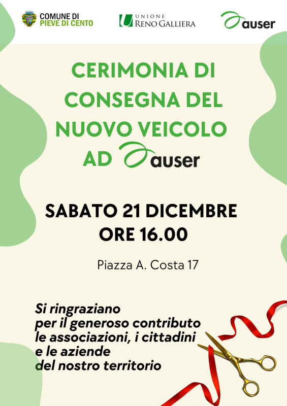 Sabato 21 dicembre, alle ore 16.00 in piazza A. Costa, si svolgerà la cerimonia di consegna del nuovo veicolo all'associazione Auser, che lo utilizzerà per il trasporto di cittadini con fragilità.