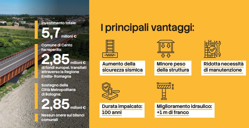 Sempre insieme al Comune di Cento sono stati affidati lavori di manutenzione, conservazione e rafforzamento del Ponte Vecchio. Questi lavori non comporteranno la chiusura al traffico e derivano dal costante monitoraggio e controllo, come previsto da Decreto del Ministero delle Infrastrutture e dei Trasporti n°204/2022, e l’intervento in oggetto rientra in un programma di manutenzione programmata e preventiva dell’infrastruttura.