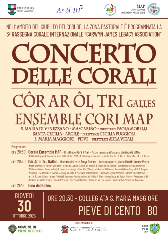 Giovedì 30 ottobre alle ore 20.30 presso la Collegiata di Santa Maria Maggiore, nell'ambito del Giubileo dei Cori della zona pastorale è programmata la 3ª Rassegna Corale Internazionale “Carwyn James Legacy Association”, con il Concerto delle Corali Côr Ar ôl Tri galles e Ensemble Cori Map (S. Maria di Venezzano - Mascarino - direttrice Paola Morelli; Santa Cecilia - Argile - direttrice Cecilia Puggioli; S. Maria Maggiore - Pieve - direttrice Aura Vitali)