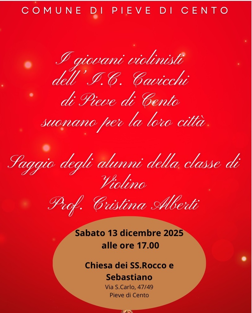 Pieve di Cento – Venerdì 13 dicembre, alle ore 17.00 , i giovani violinisti dell’Istituto Comprensivo “Cavicchi” a indirizzo musicale, guidati dalla prof.ssa Cristina Alberti, si esibiranno nel tradizionale concerto natalizio.