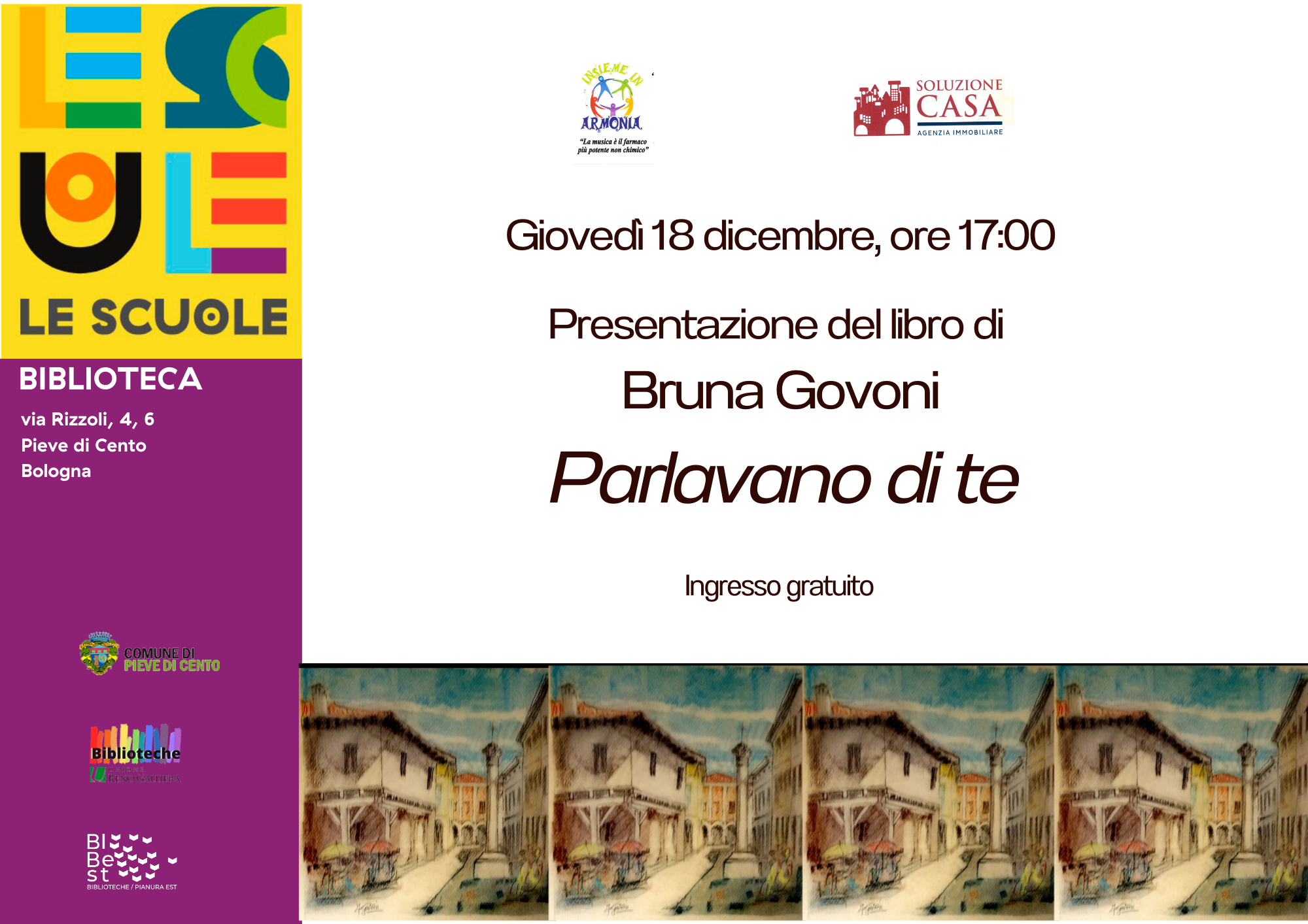 Giovedì 18 dicembre alle 17:00 presso la Biblioteca comunale "e Scuole" di Pieve di Cento si terrà la presentazione del libro di Bruna Govoni "Parlavano di te": una raccolta di prose e poesie dell'autrice dedicate alla sua Pieve.