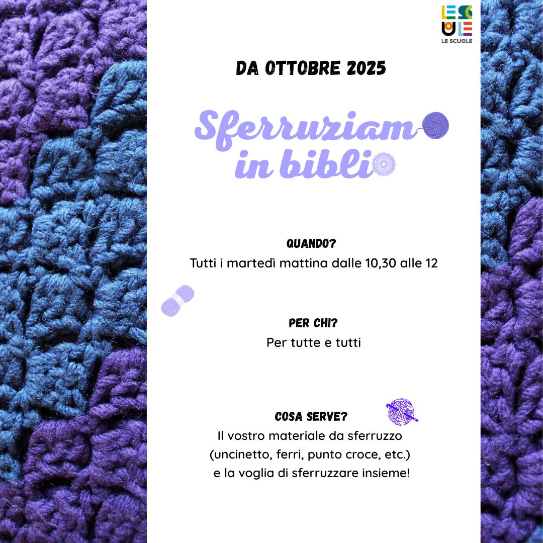 Sferruzziamo in biblio è un appuntamento fisso, aperto a chiunque abbia voglia di condividere un momento all’insegna di uncinetto, punto croce, ferri… Ma anche un po’ di leggerezza e chiacchiere.
