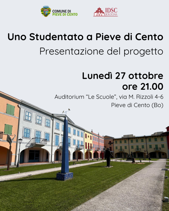 Lunedì 27 ottobre, alle ore 21.00 presso l'Auditorium de "Le Scuole" (via M. Rizzoli 4-6), si terrà l'incontro pubblico per presentare l'iniziativa "Uno studentato a Pieve di Cento". Verrà presentato il progetto, già in corso di realizzazione, che prevede la destinazione di una parte degli appartamenti adiacenti al Magi900 a residenza e spazi per studenti universitari.